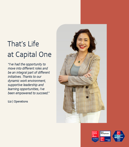 Capital One Philippines Support Services Corp. (COPSSC) partners with a third party service provider which uses analytical and preference cookies on this website. The information is used by our third party service provider to analyze non-identifiable web traffic data for us. You may refer to the COPSSC Online Privacy Standard for more information. If you proceed, you accept and agree to the use of these cookies. If not, you may discontinue by closing the browser.